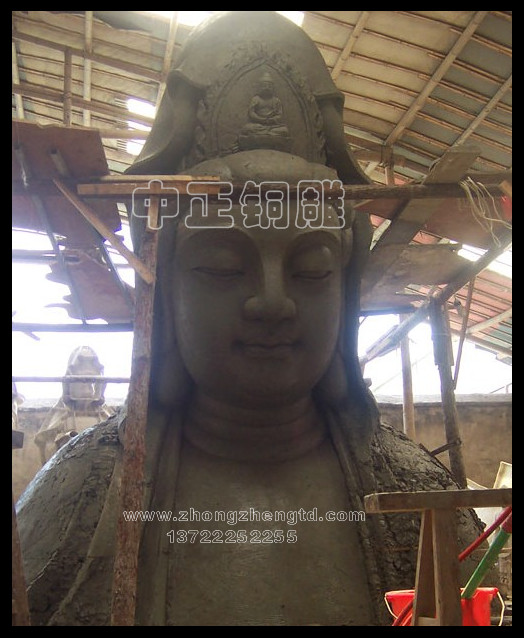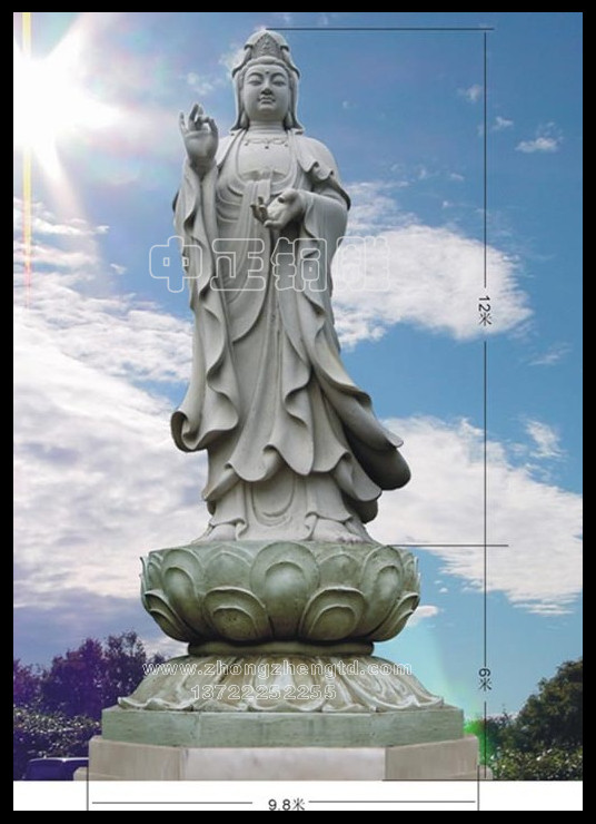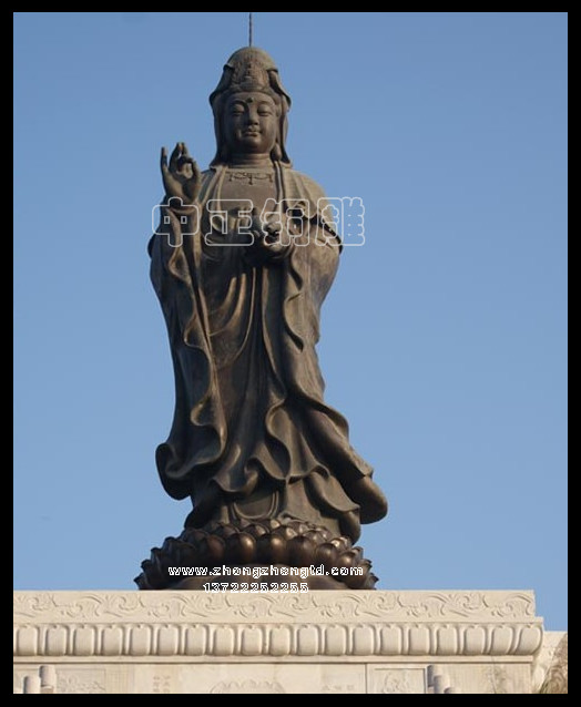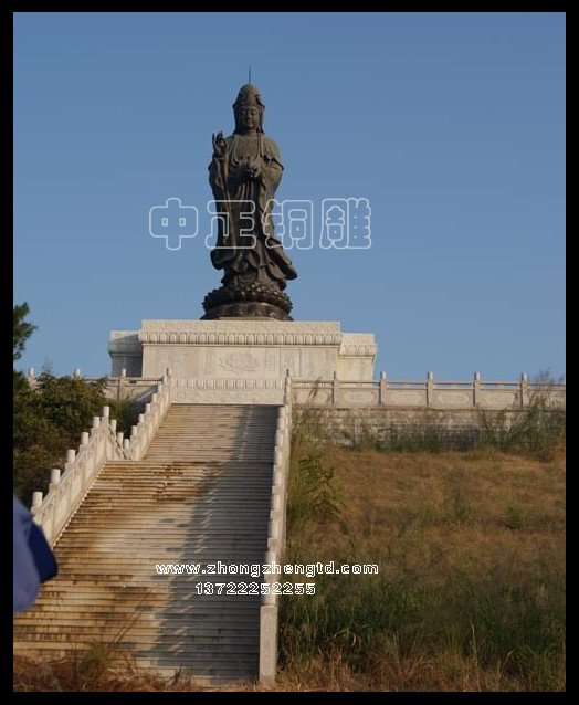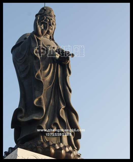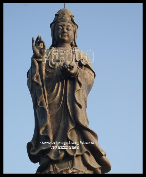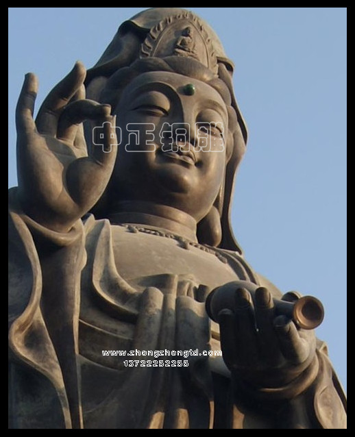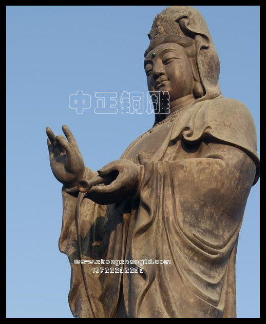 福建省漳州龍海市白水鎮龍云寺18米觀音菩薩銅像。觀世音菩薩是佛教中慈悲和智慧的象征,無論在大乘佛教還是在民間信仰,都具有極其重要的地位。以觀世音菩薩為主導的大慈悲精神,被視為大乘佛教的根本。佛經上說,觀世音是過去的正法明如來所現化,他在無量國土中,以菩薩之身到處尋聲救苦。觀世音與阿彌陀佛有著特殊的關系。他是西方三圣中的一尊, 也是一生補處的法身大士,是繼承阿彌陀佛位的菩薩,而且還有說觀世音就是阿彌陀佛的化身。觀世音菩薩手執凈瓶與楊枝,表示菩薩普救世間的廣大悲行。三界火宅,眾生心中充滿熱惱。觀世音菩薩能體察眾生的苦痛,時以瓶中的甘露水遍灑世間,使在熱惱中的一切有情皆獲清涼。眾生信仰觀世音菩薩,即渴求菩薩的甘露水,息滅內心的熱惱。佛教勸誡,觀世音菩薩確有令眾生熱惱變清涼的甘露水(甘露又喻佛法涅槃解脫之道),如時時虔誠的禮念觀音,能得菩薩的悲心救護。